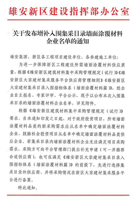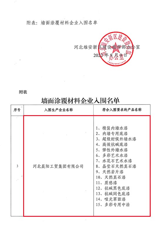 2022年8月9日,雄安新區(qū)建設(shè)指揮部辦公室發(fā)布了《關(guān)于發(fā)布增補(bǔ)入圍集采目錄墻面涂覆材料企業(yè)名單的通知》。據(jù)墻面涂覆材料企業(yè)入圍名單顯示:河北晨陽(yáng)工貿(mào)集團(tuán)有限公司(以下簡(jiǎn)稱“晨陽(yáng)水漆”)共計(jì)有15款內(nèi)外墻環(huán)保水漆產(chǎn)品入選。